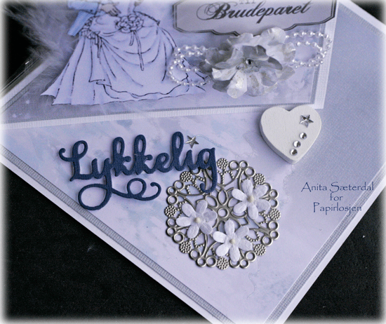 Sommerfuglane og arka er Tim Holts, Motivet, Kjære Brudepar disen, Tekst stempelet og blomane kjem alle frå Kort og Godt. Blondene er kjøpt i metervis på den lokale hobbybutikken, snøret er frå Biltema.